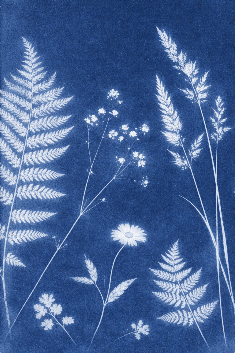 Les feuilles, les fleurs ou les plantes peuvent devenir de véritables outils créatifs. Leurs formes racontent déjà une histoire. On peut jouer avec leurs empreintes, leurs silhouettes, leurs textures. Et souvent, le résultat est beaucoup plus poétique que ce que l’on imaginait. Et depuis longtemps, j’ai envie de tester la cyanopie, qui est processus d’impression photographique qui produit une impression de couleur cyan.